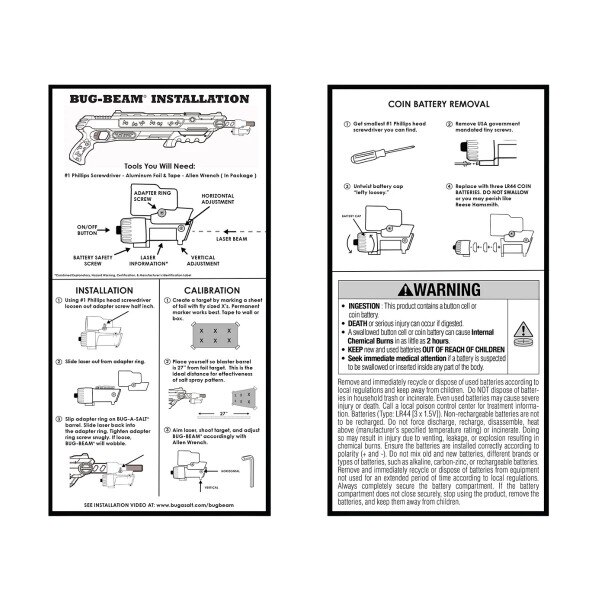 The Bug-A-Salt BUG-BEAM Adapter Kit is a laser sight accessory designed to enhance your fly hunting accuracy. Compatible with Bug-A-Salt 2.0, 2.5, 2.6, 3.0, and SHRED-ER models, this kit helps you hit targets with precision—even off the hip. Easy to install and calibrate using the included Allen wrench, the BUG-BEAM complies with FDA performance standards and comes with batteries pre-installed. Lorenzo says it even doubles as a cat toy during the off season. Not compatible with the Rooster Edition 3.0.