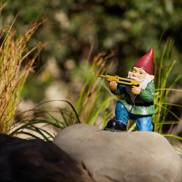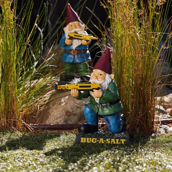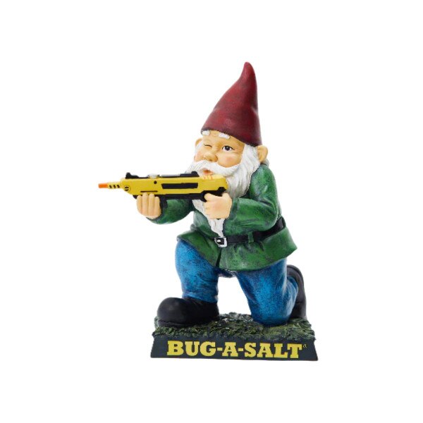 - Type: Kneeling garden gnome with Bug-A-Salt blaster