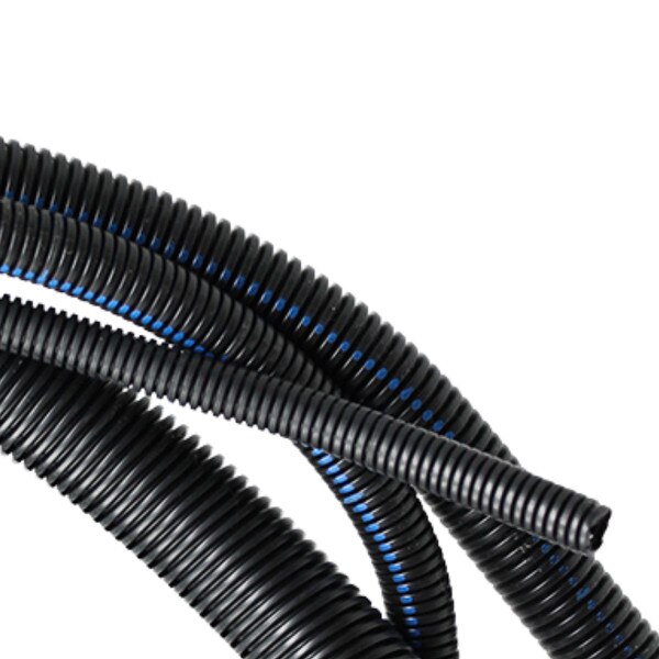 This 1" flame retardant slit tube from Drossbach features a blue identification stripe and is designed for high-performance wire protection. Ideal for automotive and industrial applications requiring flame resistance and flexibility.