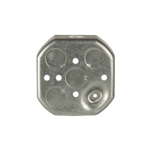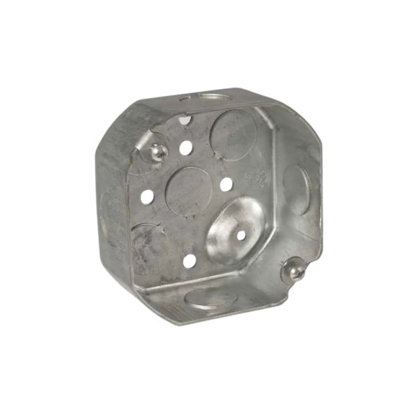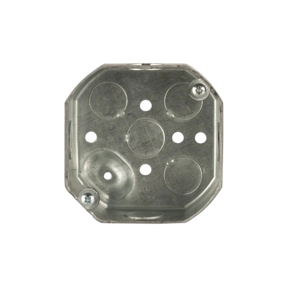 The RACO 125 is a 4" octagon box, 1-1/2" deep with nine 1/2" knockouts. Constructed from 0.0625" pre-galvanized steel. UL Listed and suitable for ceiling or wall-mounted lighting fixtures up to 50 lb. Combination Phillips/slotted screw heads included.